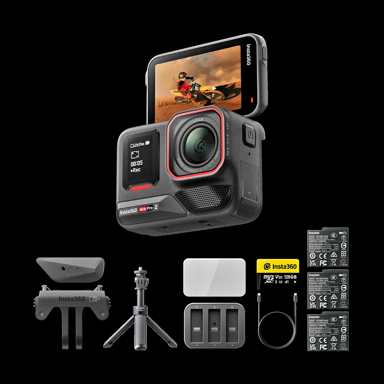 - Creator Bundle includes 1x Insta360 Ace Pro 2, 1x Wind Guard (pre-installed by default), 3x Batteries, 1x Standard Mount, 1x Mic Cap, 1x USB-C Cable, 1x 128GB microSD Card, 1x Fast Charge Hub, 1x Screen Protector and 1x Mini 2-in-1 Tripod.