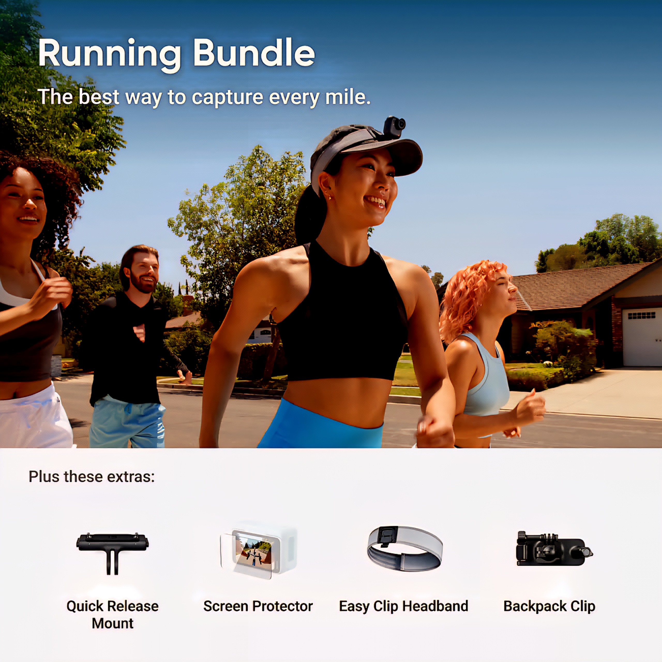 - Running Bundle includes 1x GO Ultra, 1x Quick Release Safety Cord, 1x Magnetic Easy Clip, 1x Magnet Pendant, 1x Quick Release Mount, 1x Screen Protector, 1x Easy Clip Headband, 1x Backpack Clip