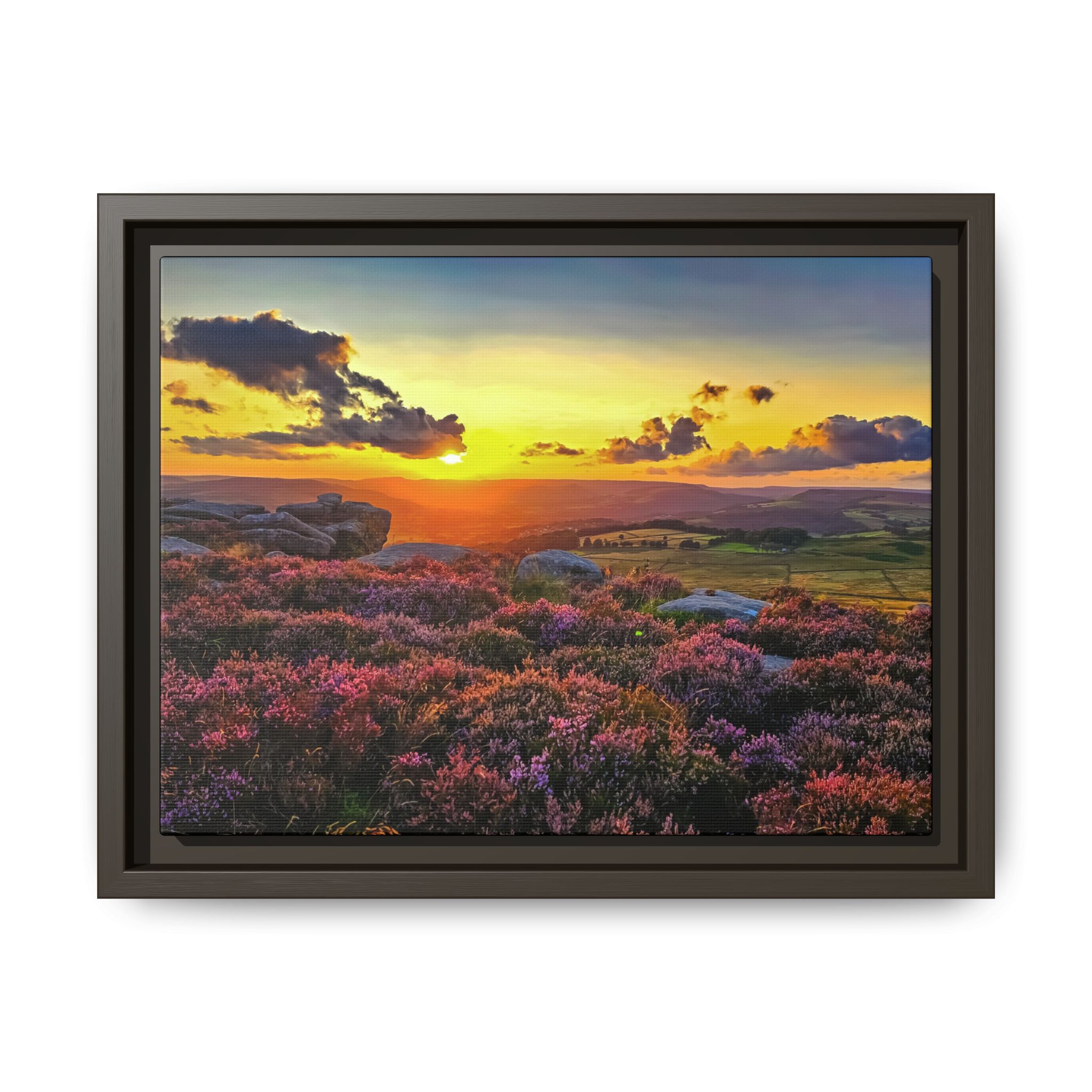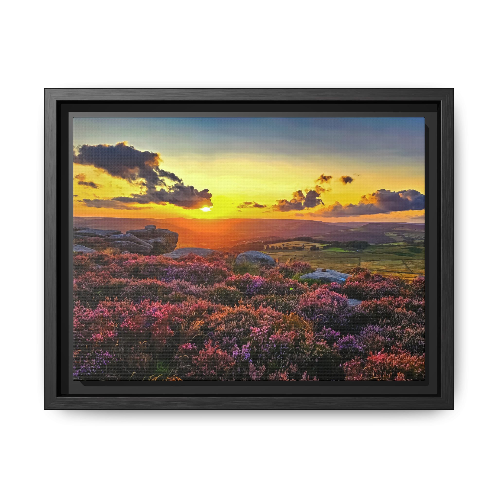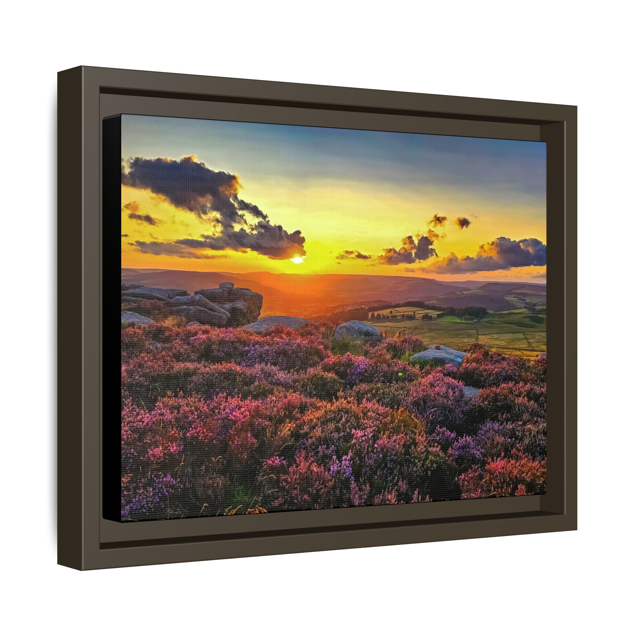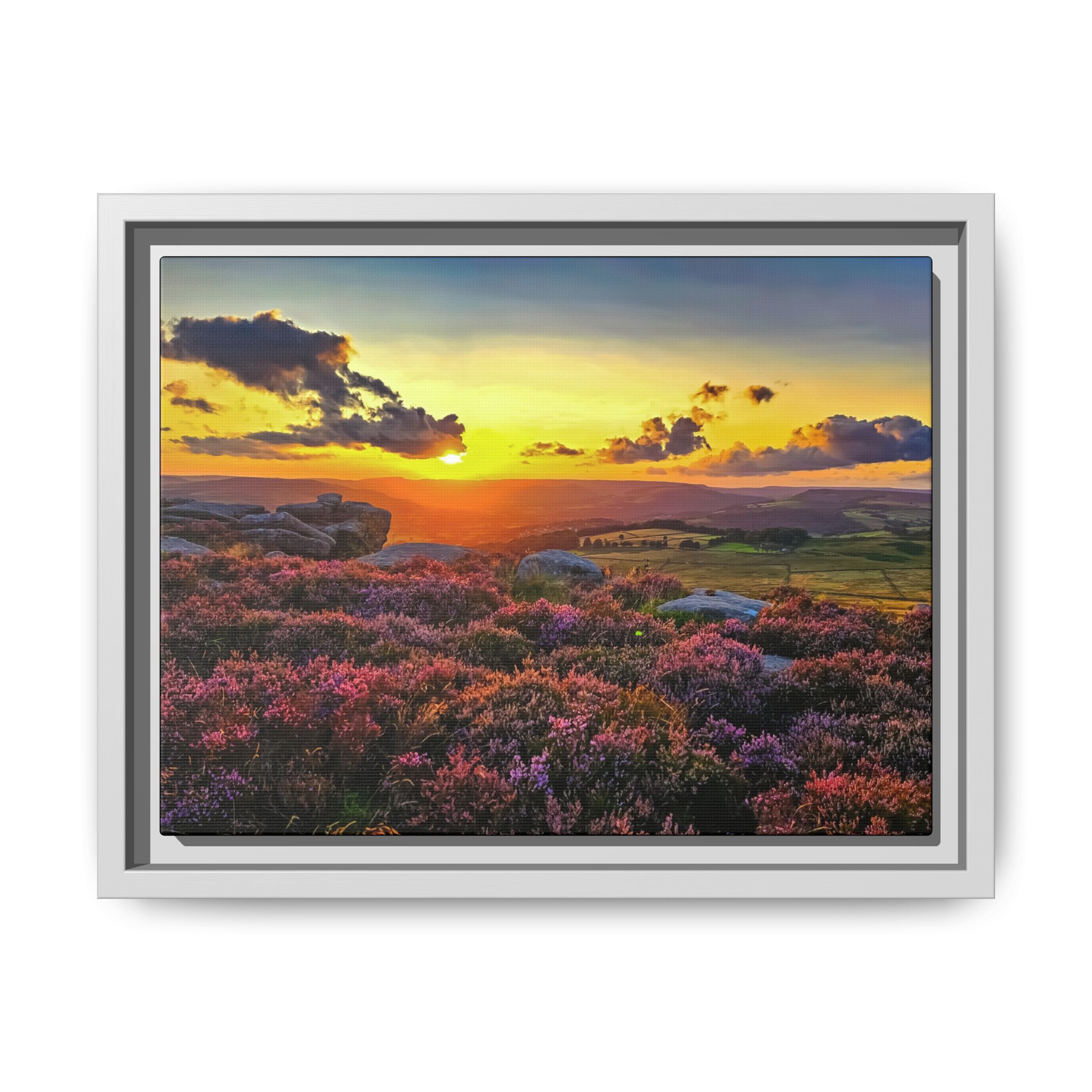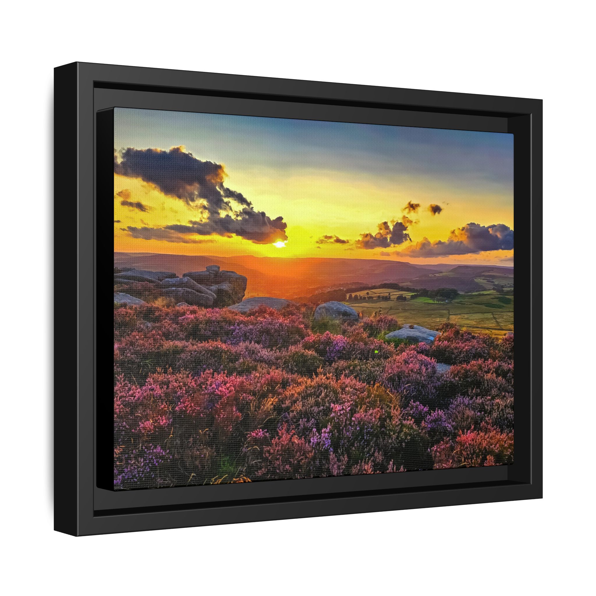 Immerse yourself in the breathtaking colors of a Peak District sunset with this stunning canvas capturing the vibrant heather in full bloom at Surprise View, Derbyshire. This framed matte canvas by Papa Bear is a celebration of nature’s splendor, where golden skies meet a sea of purple heather, creating a landscape that feels almost magical. With each glance, you’ll be transported to this tranquil moment, bathed in the soft glow of sunset, making it the perfect addition to any space that needs a touch of the natural world’s beauty and serenity.